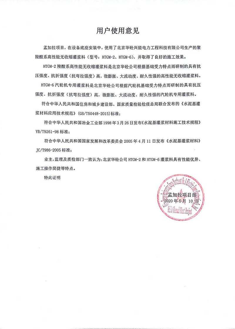 用户好评=>孟加拉帕亚拉电厂一期2×660MW燃煤发电工程-东北电力第一工程有限公司火电灌浆料