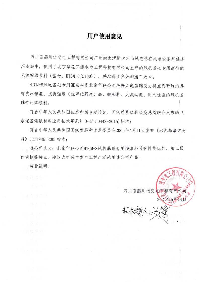 用户好评=>广州崇象清远阳山大东山风场50MW项目-四川省燕川送变电工程有限公司风电灌浆料