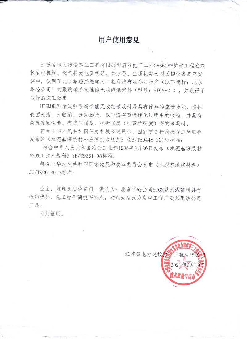 用户好评=>神华国神集团府谷公司电厂二期2×660MW工程-江苏省电力建设第三工程有限公司火电灌浆料