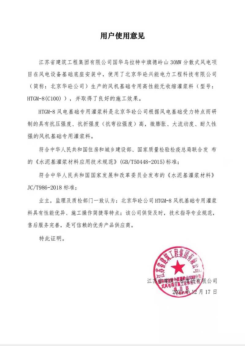用户好评=>国华乌拉特中旗德岭山30MW分散式风电项目-江苏省建工集团有限公司风电灌浆料