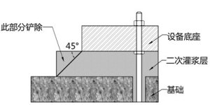 3) 设备基础灌浆完毕后,应在灌浆层终凝前(一般灌浆后3~6小时)沿设备底板边缘向外切 45°斜角(见附图),以防止应力扩散角之外的自由端产生裂缝和膨胀崩角现象。如无法进行切边处理,应在灌浆层终凝前用抹刀将其表面压光。
