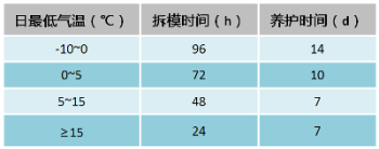 6) 在不同温度条件下的养护时间和拆模时间表: